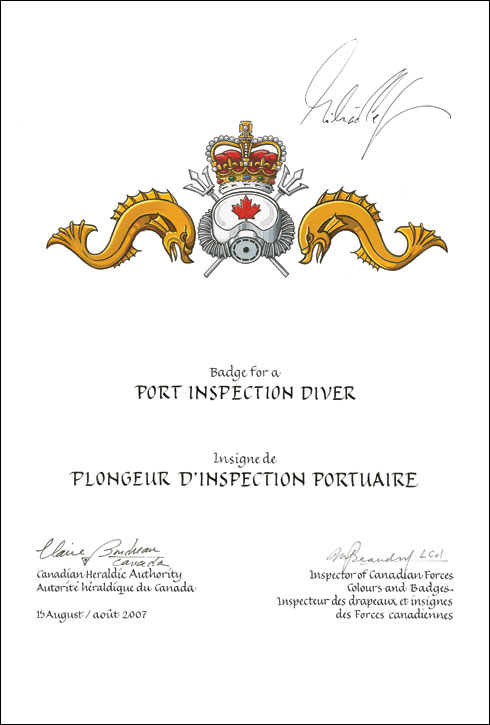 Badge for a Port Inspection DiverBlazonA diver’s mask and regulator Argent the face plate charged with a maple leaf Gules, all surmounting two tridents in saltire Argent, ensigned by the Royal Crown proper, and between two dolphins naiant respectant Or. SymbolismThe maple leaf and the Royal Crown represent service to Canada and the Sovereign. The dolphin is a long-established symbol of the sea and is representative of both the domain in which the divers operate and the way in which their own physical skills mirror, to some degree, the capacities of dolphins. The badge is modelled on similar badges worn by other diver groups in the Canadian Forces, with the mask and regulator making this badge distinctive from the others. |