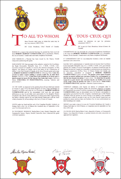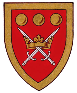 Arms of Robert Harold VandewaterBlazonGules two swords in saltire Argent enfiling a coronet erablé Or, in chief three bezants; SymbolismThe gold discs allude to Mr. Vandewater’s profession in the investment industry. The swords and coronet represent his long association with the Canadian military, in which he is currently an honorary colonel. |