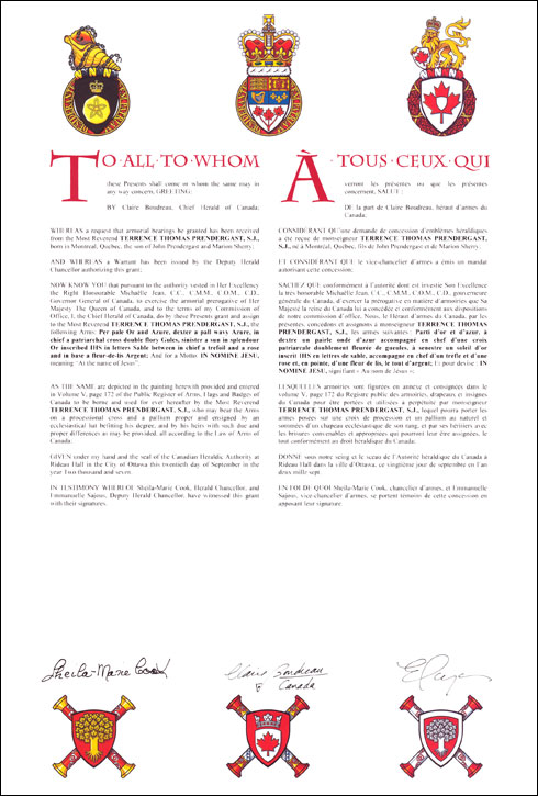 Arms of Terrence Thomas PrendergastBlazonPer pale Or and Azure, dexter a pall wavy Azure, in chief a patriarchal cross double flory Gules, sinister a sun in splendour Or inscribed IHS in letters Sable between in chief a trefoil and a rose and in base a fleur-de-lis Argent; SymbolismThe left side represents Archbishop Prendergast’s service in the archdioceses of Halifax and of Ottawa. The Y-shape refers to the confluence of the Ottawa, Rideau and Gatineau rivers, whereas the cross is that found in the emblem of the Archdiocese of Halifax: it is a “flowering cross”, emphasizing salvation brought through the cross. The right side is blue, the colour of the Blessed Virgin Mary, and the sunburst with the sacred monogram (the first letters of the name Jesus in Greek) is used as an emblem of the Society of Jesus, identifying Archbishop Prendergast as a Jesuit. The shamrock and rose reflect his Irish and English background and the fleur-de-lis his upbringing in Montreal. |