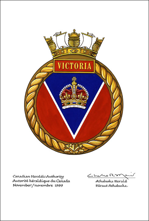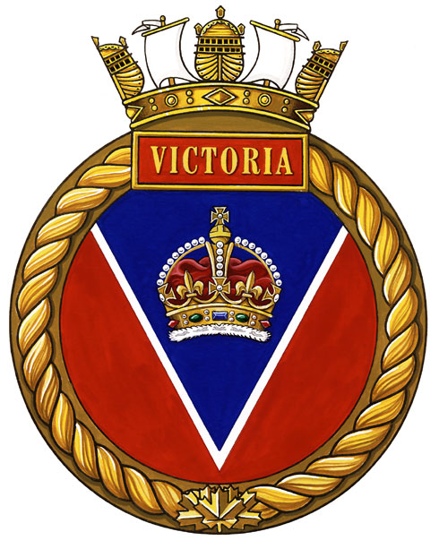 Badge of H.M.C.S. VictoriaBlazonGules on a pile Argent another Azure charged with a representation of the Royal Crown proper; SymbolismThe vessel was named for the City of Victoria, British Columbia, and the badge is derived from the shield of the City's Coat of Arms. The colours of the City's shield have been reversed to place the colour blue, associated with the navy, above all other colours. The Crown, in a form often used during Queen Victoria's reign, is depicted on the blue portion of the badge. |