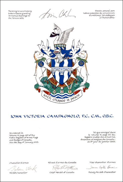 Arms of Iona Victoria Hardy (Campagnolo)BlazonAzure two pallets wavy, overall a double arched bridge Argent masoned Azure; SymbolismThe colours were chosen by Her Honour. The wavy white stripes represent both the Skeena and the Fraser, the two rivers which have most deeply influenced her life and career, and they also symbolize her two daughters. The bridge is a metaphor for bringing people together, a central part of Her Honour's personal philosophy and a major theme of her work as Lieutenant-Governor. |