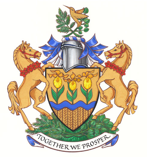 SupportersBlazonTwo horses Or each bridled, gorged with western red lilies Gules and standing on a mount of spruce and poplar branches Vert; SymbolismThe horses represent statues in the community. One, called “Coming out of the barrels,” depicts chuck wagons. Others are by local artist Susan Thalheimer Velder incorporating images of a mounted Count von Imhoff, an artist who moved to the town, and Her Majesty The Queen on her Canadian horse Burmese. The horses are bridled to show that they are in service. The western red lily represents the province. |