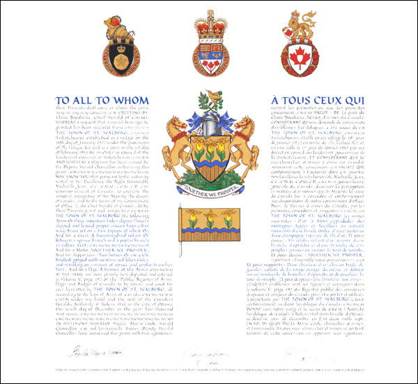 Arms of The Town of St. WalburgBlazonOr three mountain lady’s slipper flowers slipped and leaved proper issuant from a bar wavy Azure set on a base tapissé of wheat Or; SymbolismThe shield represents the town’s environmental sensitivities within an area of natural beauty. The wavy bar represents the waters that are necessary to support the area’s vegetation. The town was named after Walburga, wife of an early settler, Rudolph Musch. The wheat alludes to the mixed farming practised in the area and also to the name of Saint Walburga because three ears of grain appear with her in sacred art. She was reported as skilled in the practice of medicine and herbs. The plants are a reminder of the careful environmental planning that facilitated the survival of a marsh and rare flowers through redirecting water flow and transplanting plants. |