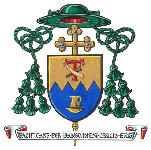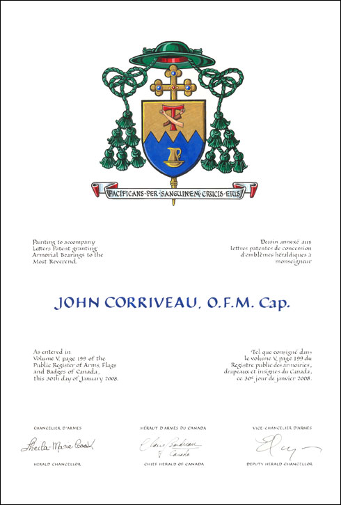 Arms of John CorriveauBlazonPer fess dancetty Or and Azure, in chief a tau cross Gules surmounted by two arms in saltire, that in bend naked that in bend sinister habited as a Franciscan proper, both with hands pierced Gules, in base a jug within a basin Or; SymbolismThe jagged horizontal line represents the mountains at Nelson, British Columbia, with the gold upper half reflecting the colour of the setting sun. In one sense, it separates the shield into parts of calling and service. The emblem in the upper part of the shield is that of the Capuchin Order of Friars Minor, symbolizing Bishop Corriveau’s membership in this order. The red Tau cross, historically associated with St. Francis, signifies the blood of the cross. The crossed arms represent Christ (the naked arm) and St. Francis of Assisi (the robed arm), signifying for St. Francis “peace through the blood of the cross”. The lower half is coloured blue to speak of Christ’s mother Mary, the titular patron of the cathedral in Nelson. As well, the blue combined with the emblem of jug and basin alludes to the foot-washing ceremony by Christ. Thus, it represents a servant-leader ready to serve. |
