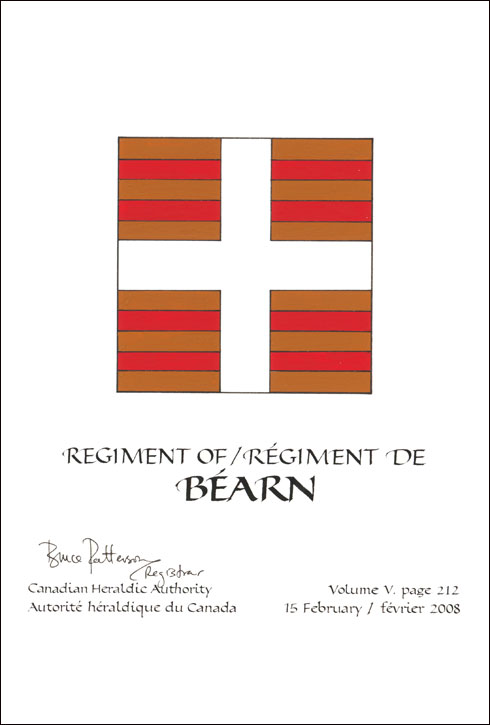 Flag of the Regiment of BéarnBlazonTenné four barrulets Gules surmounted by a cross Argent; SymbolismThe flag shown here is one of the historic flags of Canada in that it flew, or was believed to have flown, in what is today Canada. It has been selected along with 14 other flags to be included on a poster showing a selection of historical flags of New France. |