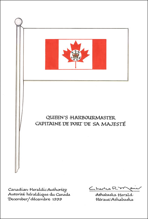 Flag of the Queen's HarbourmasterBlazonArgent thereon the national flag of Canada the maple leaf charged with a plate thereon the Royal Crown proper inscribed above with Q.H.M. and below C.P.S.M. in letters Sable; SymbolismThe flag shown here was chosen with 14 other flags to be included on a heritage poster showing a selection of military flags of Canada. It is either still in use, or is a historical flag in the sense that it was in use in what is now Canada. These 15 fifteen flags, selected from among dozens of others, do not have a written symbolism. |