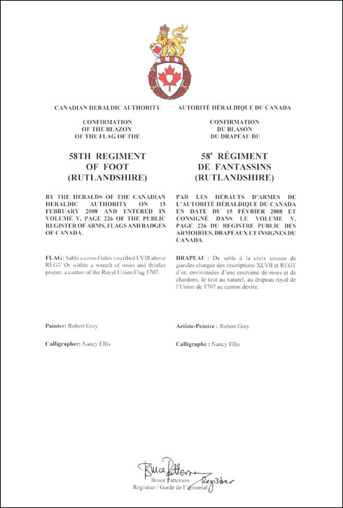 Flag of the 58th Regiment of Foot (Rutlandshire)BlazonSable a cross Gules inscribed LVIII above REGT Or within a wreath of roses and thistles proper, a canton of the Royal Union Flag 1707; SymbolismThe flag shown here is one of the historic flags of Canada in that it flew, or was believed to have flown, in what is today Canada. It has been selected along with 14 other flags to be included on a heritage poster showing a selection of historical flags of British North America. |