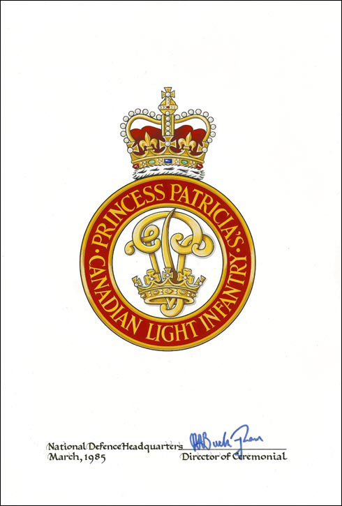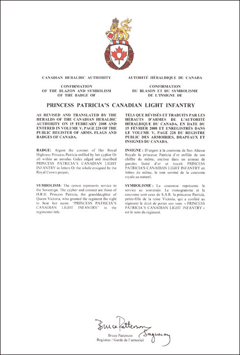 Badge of Princess Patricia’s Canadian Light InfantryBlazonArgent the coronet of Her Royal Highness Princess Patricia enfiled by her cypher Or all within an annulus Gules edged and inscribed PRINCESS PATRICIA’S CANADIAN LIGHT INFANTRY in letters Or the whole ensigned by the Royal Crown proper; SymbolismThe crown represents service to the Sovereign. The cypher and coronet are those of H.R.H. Princess Patricia, the granddaughter of Queen Victoria, who granted the regiment the right to bear her name. “PRINCESS PATRICIA’S CANADIAN LIGHT INFANTRY” is the regimental title. |