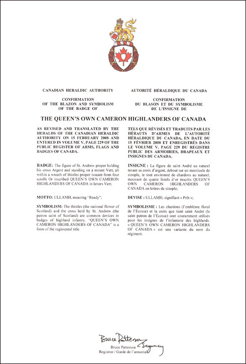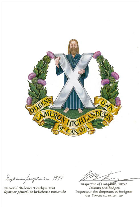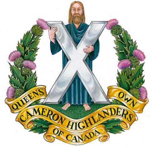 Badge of The Queen’s Own Cameron Highlanders of CanadaBlazonThe figure of St. Andrew proper holding his cross Argent and standing on a mount Vert, all within a wreath of thistles proper issuant from four scrolls Or inscribed QUEEN’S OWN CAMERON HIGHLANDERS OF CANADA in letters Vert; SymbolismThe thistles (the national flower of Scotland) and the cross held by St. Andrew (the patron saint of Scotland) are common devices in badges of highland infantry. “QUEEN’S OWN CAMERON HIGHLANDERS OF CANADA” is a form of the regimental title. |