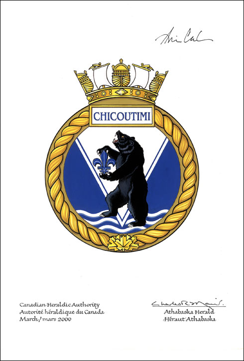 Badge of H.M.C.S. ChicoutimiBlazonAzure in front of a pile Argent bordered throughout by a letter "V" also Argent fimbriated Azure surmounting three bars wavy in base Argent a bear rampant Sable holding in the forepaws a fleur-de-lis Azure; SymbolismThe badge incorporates a "V" design in blue and white in reference to the Victoria class of submarines and the colours of Quebec. The bear is an animal indigenous to the Chicoutimi area representing ferocity and strength. It protects a fleur-de-lis and stands on waves representing both the maritime environment in which the vessel operates and the rivers and lakes of the Chicoutimi area. |
