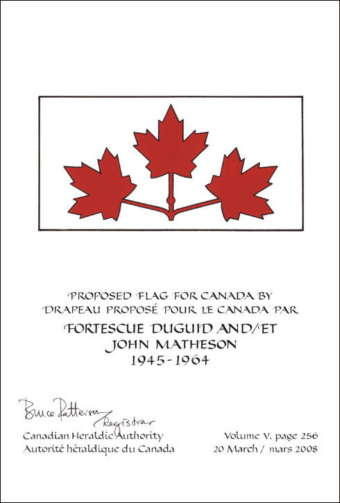 Proposed Flag for Canada: Fortescue Duguid and John Matheson, 1945-1964BlazonArgent a sprig of three maple leaves Gules; SymbolismThe flag shown here was chosen with 14 other flags to be included on a heritage poster showing a selection of proposed flags for Canada prior to 1965. These 15 proposed flags, selected from among hundreds of other proposals for their variety of colours and concepts, do not have symbolism that has been formally recorded. |