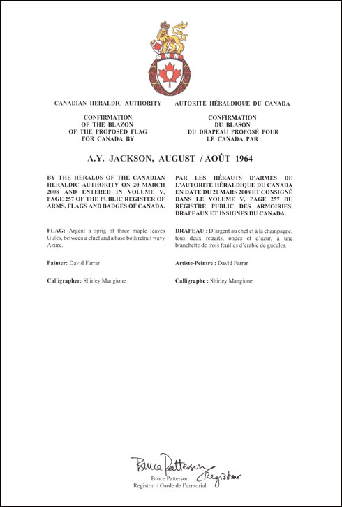 Proposed Flag for Canada: A.Y. Jackson, August 1964BlazonArgent a sprig of three maple leaves Gules, between a chief and a base both retrait wavy Azure; SymbolismThe flag shown here was chosen with 14 other flags to be included on a heritage poster showing a selection of proposed flags for Canada prior to 1965. These 15 proposed flags, selected from among hundreds of other proposals for their variety of colours and concepts, do not have symbolism that has been formally recorded. |