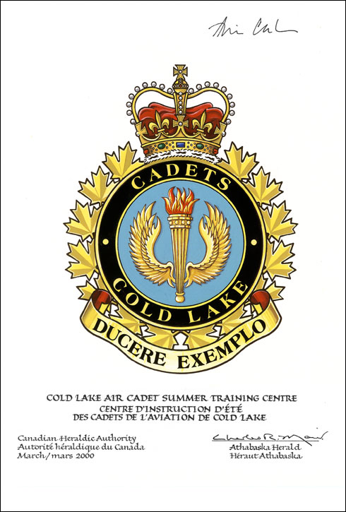 Badge of the Cold Lake Air Cadet Summer Training CentreBlazonBleu Céleste a torch Or enflamed Gules within a vol Or all within an annulus Sable fimbriated and inscribed CADETS · COLD LAKE in letters Or; SymbolismThe badge signifies the air cadet training programmes carried out at this establishment. |