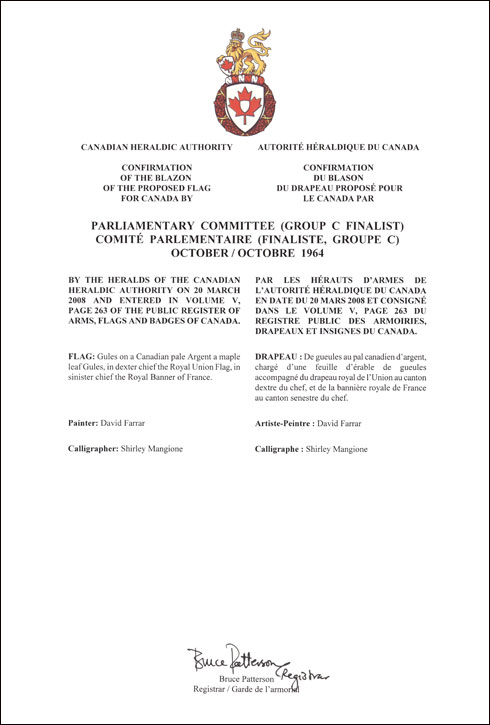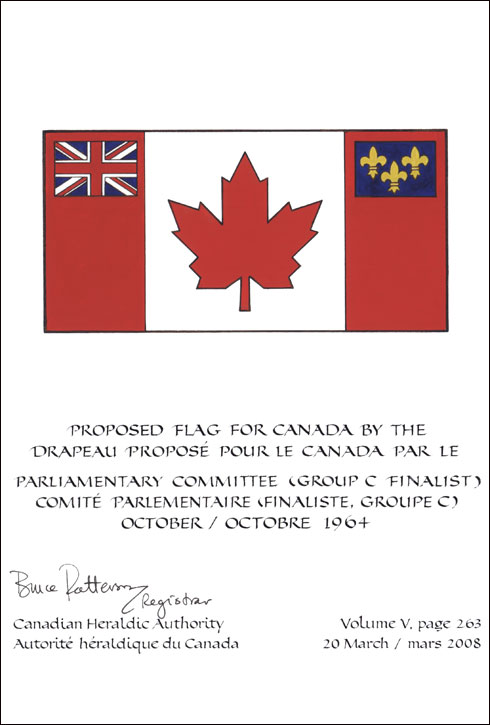 Proposed Flag for Canada: Parliamentary Committee (Group C Finalist), October 1964BlazonGules on a Canadian pale Argent a maple leaf Gules, in dexter chief the Royal Union Flag, in sinister chief the Royal Banner of France; SymbolismThe flag shown here was chosen with 14 other flags to be included on a heritage poster showing a selection of proposed flags for Canada prior to 1965. These 15 proposed flags, selected from among hundreds of other proposals for their variety of colours and concepts, do not have symbolism that has been formally recorded. |