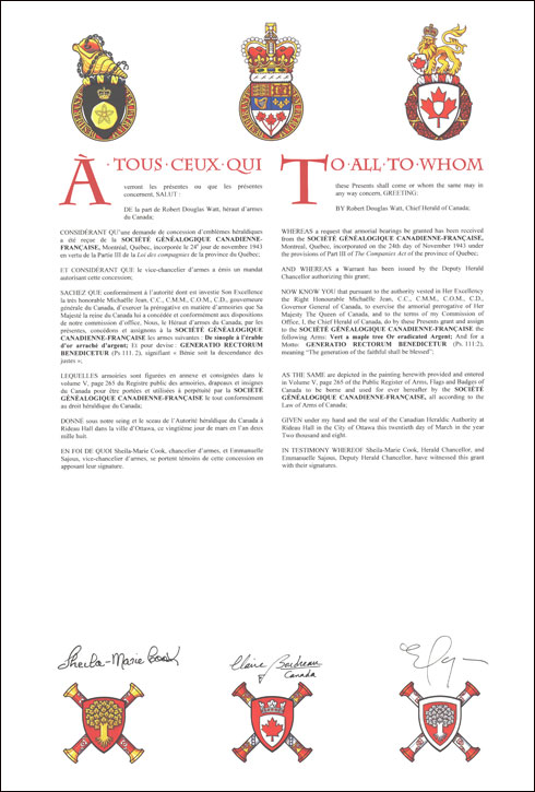 Additional InformationCreator(s)Original concept of Julien Déziel, at the behest of the president-founder Father Archange Godbout, O.F.M. PainterLinda Nicholson CalligrapherNancy Ellis Recipient TypeCivil Institution