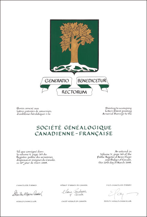 Arms of the Société généalogique canadienne-françaiseBlazonVert a maple tree Or eradicated Argent; SymbolismThe arms were created by the late Father Julien Déziel in 1943. The colour green was chosen because it is associated with life and spring, therefore with renewal and hope, values that are important to the Société. The tree is the most recognizable genealogical symbol, and the maple tree was chosen to identify the Society as French-Canadian. |