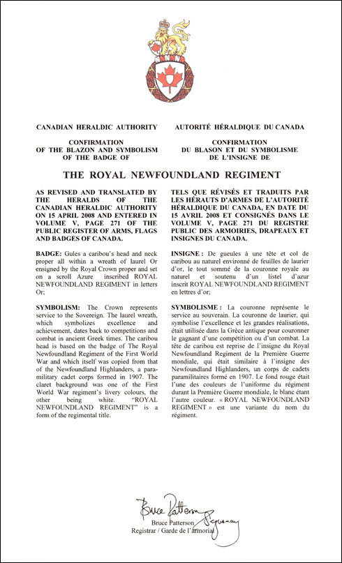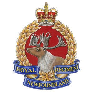 Badge of The Royal Newfoundland RegimentBlazonGules a caribou’s head and neck proper all within a wreath of laurel Or ensigned by the Royal Crown proper and set on a scroll Azure inscribed ROYAL NEWFOUNDLAND REGIMENT in letters Or; SymbolismThe Crown represents service to the Sovereign. The laurel wreath, which symbolizes excellence and achievement, dates back to competitions and combat in ancient Greek times. The caribou head is based on the badge of The Royal Newfoundland Regiment of the First World War and which itself was copied from that of the Newfoundland Highlanders, a para-military cadet corps formed in 1907. The claret background was one of the First World War regiment’s livery colours, the other being white. “ROYAL NEWFOUNDLAND REGIMENT” is a form of the regimental title. |