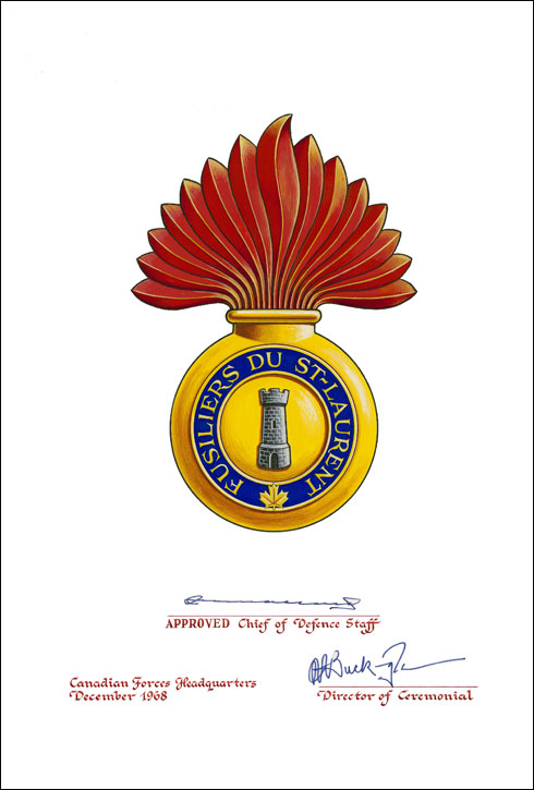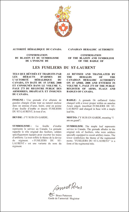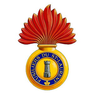 Badge of Les Fusiliers du St-LaurentBlazonA grenade Or enflamed Gules charged with a tower proper within an annulus Azure edged, inscribed FUSILIERS DU ST-LAURENT and charged in base with a maple leaf Or; SymbolismThe maple leaf represents service to Canada. The grenade alludes to the original role of fusiliers, who were soldiers specially equipped to escort artillery trains. The tower symbolizes the theme of the regimental motto. “FUSILIERS DU ST-LAURENT” is a form of the regimental title. |