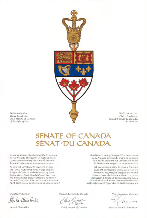 Confirmation of the right to bear the shield of the Royal Arms of Canada surmounting the Mace of the Senate