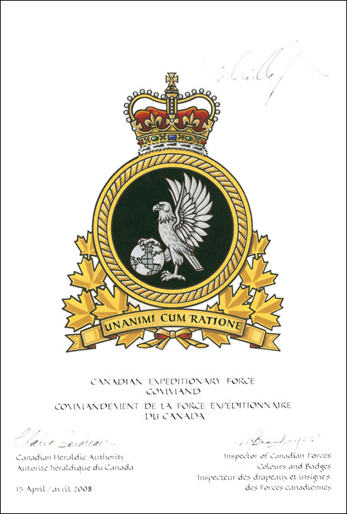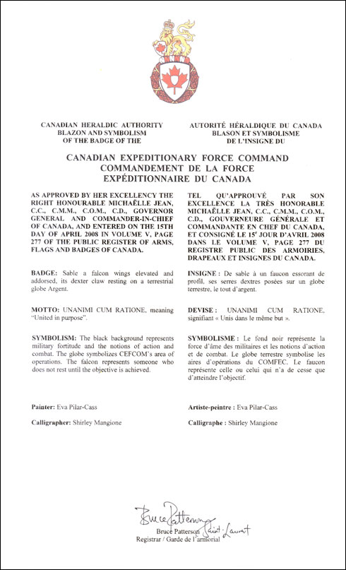 Badge of Canadian Expeditionary Force CommandBlazonSable a falcon wings elevated and addorsed, its dexter claw resting on a terrestrial globe Argent; SymbolismThe black background represents military fortitude and the notions of action and combat. The globe symbolizes CEFCOM’s area of operations. The falcon represents someone who does not rest until the objective is achieved. |