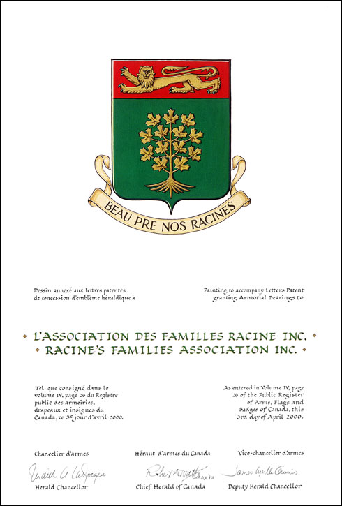 Arms of the Racine's Families Association Inc.BlazonVert a maple tree eradicated Or on a chief cousu Gules a lion passant guardant Or; SymbolismThe shield's green background recalls the original lands and the seigneury "Beau pré", where the American ancestors of the Racine family, Étienne Racine and Marguerite Martin, lived. The nine tree roots represent their children, and are also an allusion to the Association's surname, Racine. The thirteen maple leaves symbolize the thirteen generations of their many descendants since their marriage in 1638. The gold lion on a red background has for a millennium been a part of the coat of arms of Normandy, and here it denotes the origins of Étienne Racine. |