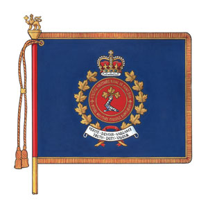 Flag of the Royal Military College Saint-JeanBlazonAzure on a torteau a dexter arm embowed, vambraced and gauntleted Argent, issuant from a torse Argent and Azure, the hand holding a sprig of three maple leaves Or, all within an annulus Gules edged, inscribed COLLÈGE MILITAIRE ROYAL DE SAINT-JEAN / ROYAL MILITARY COLLEGE SAINT-JEAN, charged with two fleurs-de-lis, environed by two branches of maple crossed in saltire at the base Or and bound by a ribbon Gules surmounted by a scroll Argent inscribed VÉRITÉ • DEVOIR • VAILLANCE / TRUTH • DUTY • VALOUR in letters Sable, the whole ensigned by the Royal Crown proper; SymbolismNot applicable; |