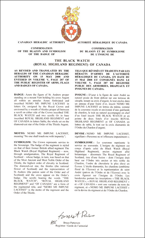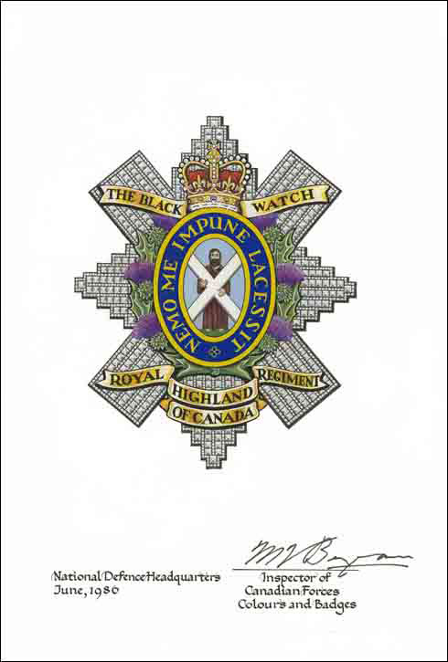 Badge of The Black Watch (Royal Highland Regiment) of CanadaBlazonAzure the figure of St. Andrew proper standing on a mount Vert holding his cross Argent all within an annulus Azure fimbriated and inscribed NEMO ME IMPUNE LACESSIT in letters Or, ensigned by the Royal Crown and environed by a wreath of thistles proper all between a scroll on either side of the Crown inscribed THE BLACK WATCH and two scrolls Or in base inscribed ROYAL HIGHLAND REGIMENT and OF CANADA in letters Sable, the whole set on the diamond-cut star of the Order of the Thistle Argent; SymbolismThe Crown represents service to the Sovereign. The badge of the regiment is styled on that of their former British allied regiment The Black Watch (Royal Highland Regiment) – now, through amalgamation, The Royal Regiment of Scotland – whose badge, in turn, was based on that of the Most Ancient and Most Noble Order of the Thistle, the highest order of chivalry in Scotland. The diamond-cut star, the thistles (the national flower of Scotland) and the representation of St. Andrew (the patron saint of the Order and of Scotland) and the cross appear on the Order’s badge. The scrolls bearing the words “THE BLACK WATCH”, “ROYAL HIGHLAND REGIMENT” and “OF CANADA” are a form of the regimental title, and “NEMO ME IMPUNE LACESSIT” is the motto of the regiment and the Order of the Thistle. |