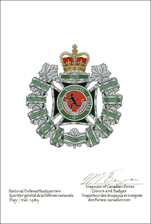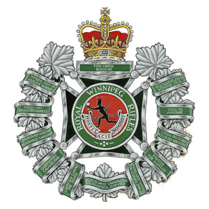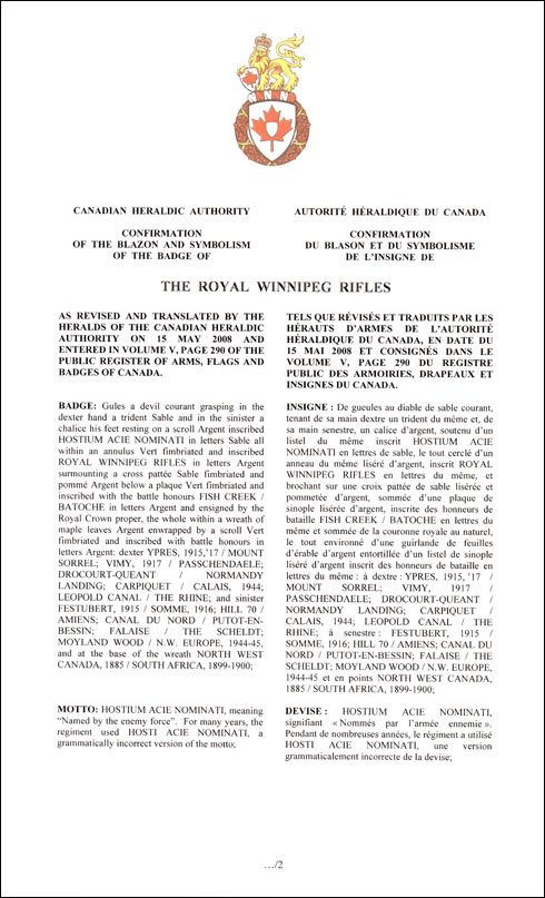 Badge of The Royal Winnipeg RiflesBlazonGules a devil courant grasping in the dexter hand a trident Sable and in the sinister a chalice his feet resting on a scroll Argent inscribed HOSTIUM ACIE NOMINATI in letters Sable all within an annulus Vert fimbriated and inscribed ROYAL WINNIPEG RIFLES in letters Argent surmounting a cross pattée Sable fimbriated and pommé Argent below a plaque Vert fimbriated and inscribed with the battle honours FISH CREEK / BATOCHE in letters Argent and ensigned by the Royal Crown proper, the whole within a wreath of maple leaves Argent enwrapped by a scroll Vert fimbriated and inscribed with battle honours in letters Argent: dexter YPRES, 1915,’17 / MOUNT SORREL; VIMY, 1917 / PASSCHENDAELE; DROCOURT-QUEANT / NORMANDY LANDING; CARPIQUET / CALAIS, 1944; LEOPOLD CANAL / THE RHINE; and sinister FESTUBERT, 1915 / SOMME, 1916; HILL 70 / AMIENS; CANAL DU NORD / PUTOT-EN-BESSIN; FALAISE / THE SCHELDT; MOYLAND WOOD / N.W. EUROPE, 1944-45, and at the base of the wreath NORTH WEST CANADA, 1885 / SOUTH AFRICA, 1899-1900; SymbolismThe wreath of maple leaves represent service to Canada, and the crown, service to the Sovereign. The Maltese cross, which is based on the insignia of the Royal Guelphic Order, is common among badges of rifle regiments. The black devil carrying a trident and offering a chalice preserves the legend that during the North-West Rebellion the soldiers were referred to by the opposing forces as “little black devils” because of their almost black (dark rifle green) uniforms. Hence, the adoption of the regiment’s motto “HOSTIUM ACIE NOMINATI”, which means “Named by the enemy force”. “FISH CREEK”, “BATOCHE”, “YPRES, 1915,’17”, “MOUNT SORREL”, “VIMY, 1917”, “PASSCHENDAELE”, “DROCOURT-QUEANT”, “NORMANDY LANDING”, “CARPIQUET”, “CALAIS, 1944”, “LEOPOLD CANAL”, “THE RHINE”, “FESTUBERT, 1915”, “SOMME, 1916”, “HILL 70”, “AMIENS”, “CANAL DU NORD”, “PUTOT-EN-BESSIN", “FALAISE”, “THE SCHELDT”, “MOYLAND WOOD”, “N.W. EUROPE, 1944-45’, “NORTH WEST CANADA, 1885” and ‘SOUTH AFRICA 1899-1900” are regimental battle honours. “ROYAL WINNIPEG RIFLES” is a form of the regimental title. |