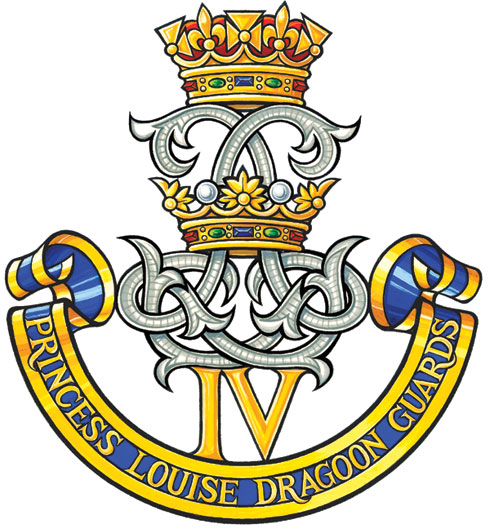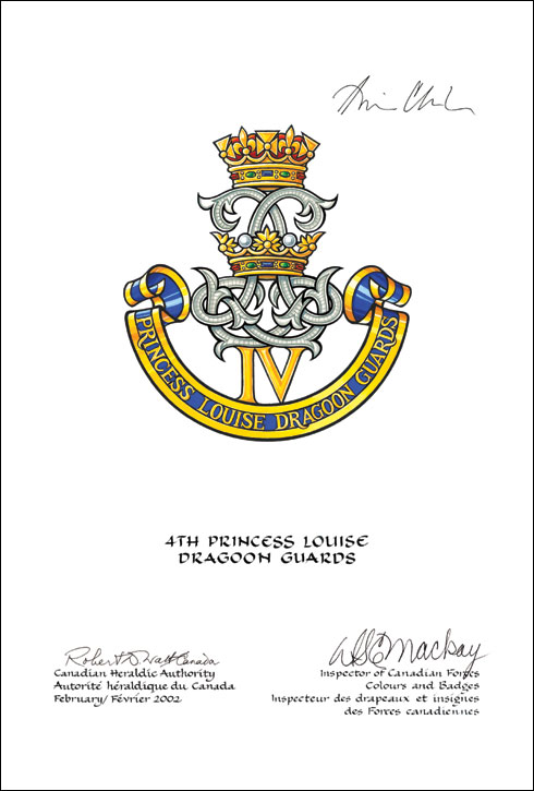 Badge of the 4th Princess Louise Dragoon GuardsBlazonThe coronet of a marquess proper enfiled by a monogram composed of two "Ls" intertwined Argent, above the Roman numerals "IV" Or resting on a scroll Azure edged and inscribed PRINCESS LOUISE DRAGOON GUARDS in letters Or, the whole surmounted by the coronet of a daughter of the Sovereign proper; SymbolismThe coronets and intertwined Ls refer to the Regiment's namesake, Princess Louise (1848-1939), daughter of Queen Victoria, and her husband the Marquess of Lorne (1845-1914), Governor General of Canada from 1878 to 1883. The Roman numerals "IV" recalls the name of the regiment. In 1936, the 4th Hussars of Canada were amalgamated with the Princess Louise Dragoon Guards and redesignated 4th Princess Louise Dragoon Guards. |