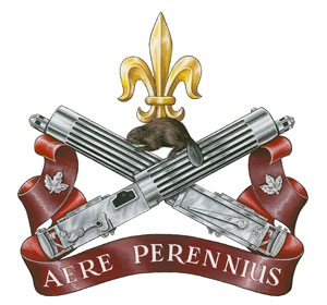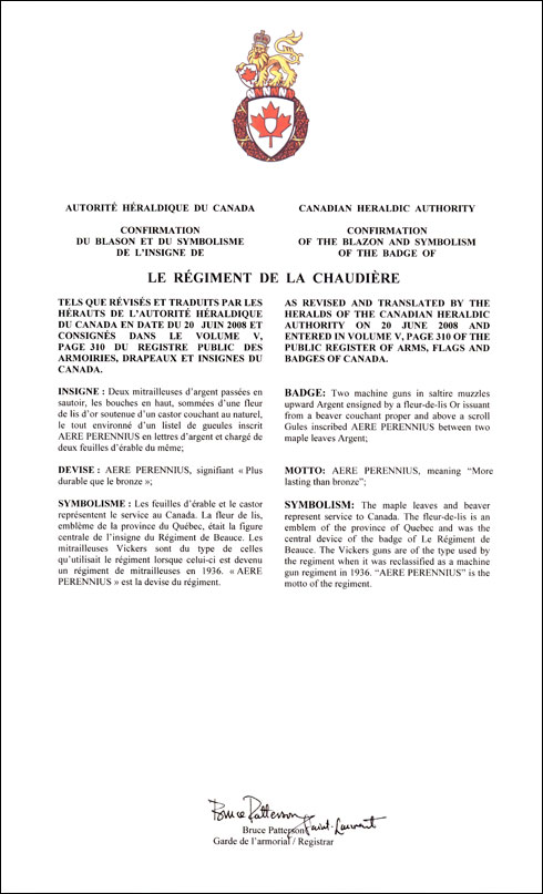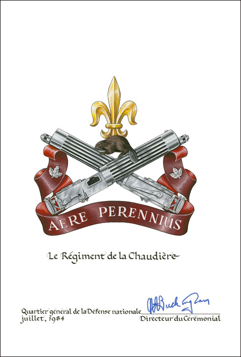 Badge of Le Régiment de la ChaudièreBlazonTwo machine guns in saltire muzzles upward Argent ensigned by a fleur-de-lis Or issuant from a beaver couchant proper and above a scroll Gules inscribed AERE PERENNIUS between two maple leaves Argent; SymbolismThe maple leaves and beaver represent service to Canada. The fleur-de-lis is an emblem of the province of Quebec and was the central device of the badge of Le Régiment de Beauce. The Vickers guns are of the type used by the regiment when it was reclassified as a machine gun regiment in 1936. “AERE PERENNIUS” is the motto of the regiment. |