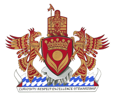 CrestBlazonA man sejant affronty on a bench, his dexter hand grasping a staff ensigned by an orca contourné embowed, his sinister hand raised, all Or embellished Gules and in the Kwakwaka’wakw First Nation style; SymbolismThis represents the idea of a potlatch. The chief is welcoming those to whom he intends to distribute gifts, and the design symbolizes a place that welcomes people. |
