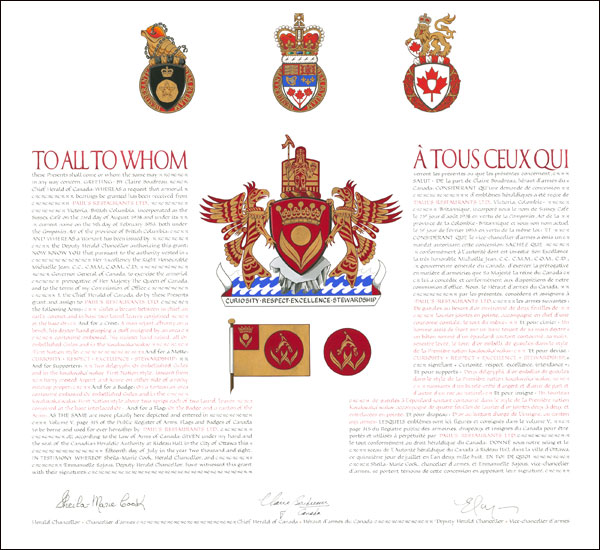 Additional InformationCreator(s)Original concept of Darrel Kennedy, Assiniboine Herald, assisted by the heralds of the Canadian Heraldic Authority. PainterLinda Nicholson CalligrapherShirley Mangione Recipient TypeCivil Institution |