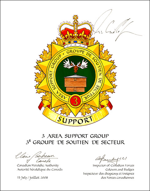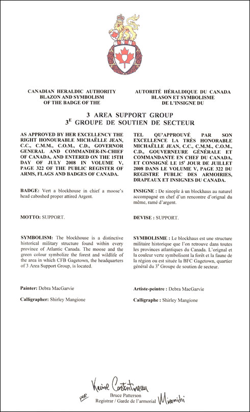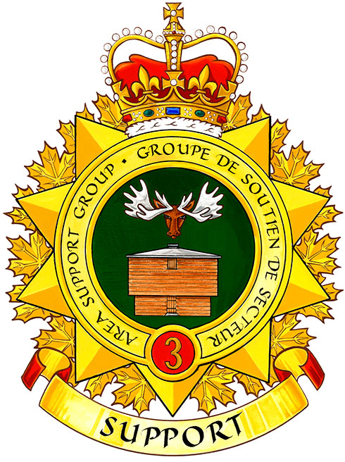 Badge of the 3 Area Support GroupBlazonVert a blockhouse in chief a moose’s head caboshed proper attired Argent; SymbolismThe blockhouse is a distinctive historical military structure found within every province of Atlantic Canada. The moose and the green colour symbolize the forest and wildlife of the area in which CFB Gagetown, the headquarters of 3 Area Support Group, is located. |