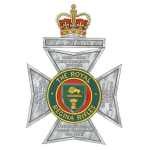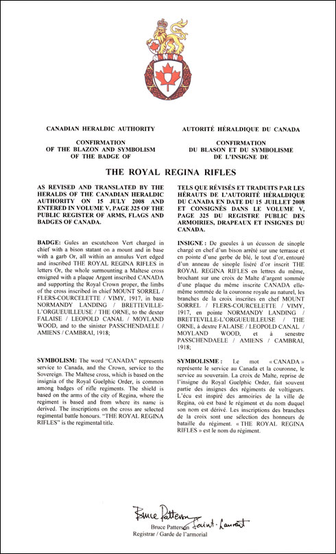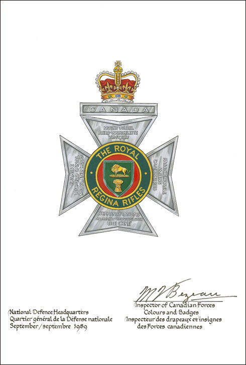 Badges of The Royal Regina RiflesBlazonGules an escutcheon Vert charged in chief with a bison statant on a mount and in base with a garb Or, all within an annulus Vert edged and inscribed THE ROYAL REGINA RIFLES in letters Or, the whole surmounting a Maltese cross ensigned with a plaque Argent inscribed CANADA and supporting the Royal Crown proper, the limbs of the cross inscribed in chief MOUNT SORREL / FLERS-COURCELETTE / VIMY, 1917, in base NORMANDY LANDING / BRETTEVILLE-L’ORGUEUILLEUSE / THE ORNE, to the dexter FALAISE / LEOPOLD CANAL / MOYLAND WOOD, and to the sinister PASSCHENDAELE / AMIENS / CAMBRAI, 1918; SymbolismThe word “CANADA” represents service to Canada, and the Crown, service to the Sovereign. The Maltese cross, which is based on the insignia of the Royal Guelphic Order, is common among badges of rifle regiments. The shield is based on the arms of the city of Regina, where the regiment is based and from where its name is derived. The inscriptions on the cross are selected regimental battle honours. “THE ROYAL REGINA RIFLES” is the regimental title. |