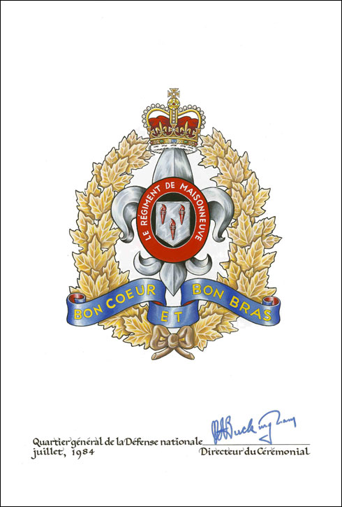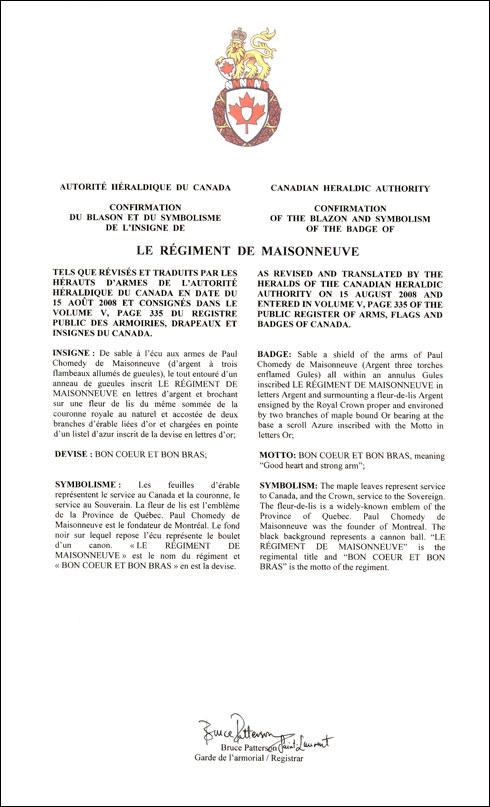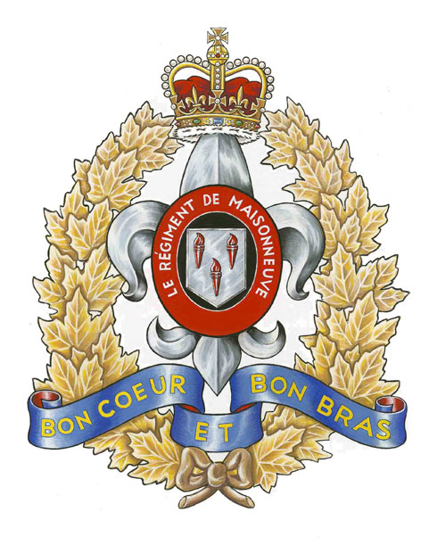 Badge of Le Régiment de MaisonneuveBlazonSable a shield of the arms of Paul Chomedy de Maisonneuve (Argent three torches enflamed Gules) all within an annulus Gules inscribed LE RÉGIMENT DE MAISONNEUVE in letters Argent and surmounting a fleur-de-lis Argent ensigned by the Royal Crown proper and environed by two branches of maple bound Or bearing at the base a scroll Azure inscribed with the Motto in letters Or; SymbolismThe maple leaves represent service to Canada, and the Crown, service to the Sovereign. The fleur-de-lis is a widely-known emblem of the Province of Quebec. Paul Chomedy de Maisonneuve was the founder of Montreal. The black background represents a cannon ball. “LE RÉGIMENT DE MAISONNEUVE” is the regimental title and “BON COEUR ET BON BRAS” is the motto of the regiment. |