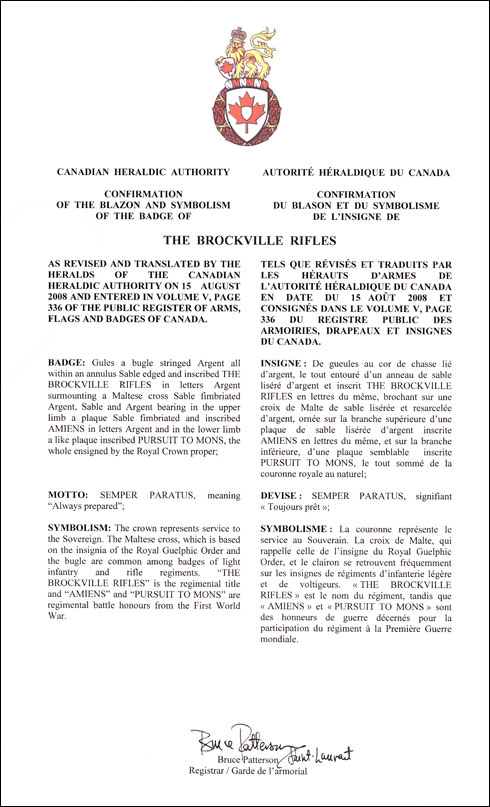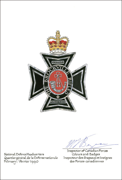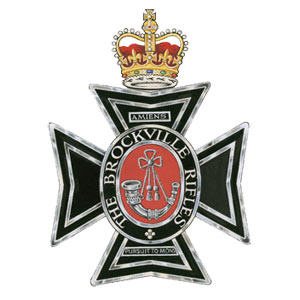 Badge of The Brockville RiflesBlazonGules a bugle stringed Argent all within an annulus Sable edged and inscribed THE BROCKVILLE RIFLES in letters Argent surmounting a Maltese cross Sable fimbriated Argent, Sable and Argent bearing in the upper limb a plaque Sable fimbriated and inscribed AMIENS in letters Argent and in the lower limb a like plaque inscribed PURSUIT TO MONS, the whole ensigned by the Royal Crown proper; SymbolismThe crown represents service to the Sovereign. The Maltese cross, which is based on the insignia of the Royal Guelphic Order and the bugle are common among badges of light infantry and rifle regiments. “THE BROCKVILLE RIFLES” is the regimental title and “AMIENS” and “PURSUIT TO MONS” are regimental battle honours from the First World War. |