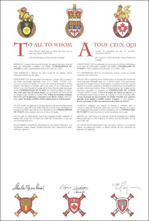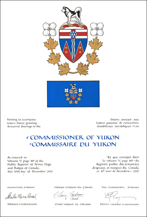 Badge of Office of the Commissioner of YukonBlazonThe Arms and Crest of Yukon proper, as registered by the Chief Herald of Canada on the 15th day of October 2006, within two branches of maple leaves Or each ensigned by a fireweed flower Argent; SymbolismThe territorial arms and crest surrounded by maple leaves and fireweed, the territorial flower, represent the role of the Commissioner in the Territory’s government. |