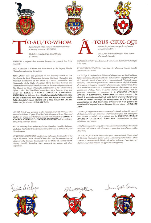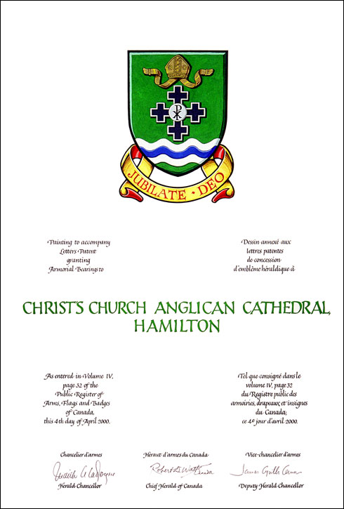 Arms of Christ's Church Anglican CathedralBlazonVert between in chief a bishop's mitre Or and in base barry wavy Argent Azure and Argent a cross crosslet Sable fimbriated Argent charged with a plate thereon the Chi Rho Sable; SymbolismThe mitre signifies that Christ’s Church is the cathedral, or seat of the bishop, of the Diocese of Niagara. The white and blue wavy bars and the green background are taken from the arms of the Diocese. The cross crosslet is a symbol of the Christian faith, and the Chi Rho, the first letters of the Greek name for Christ, is traditionally associated with foundations with the Christ Church dedication. The black colour of the crosslet is an allusion to steel and simultaneously the City of Hamilton, also know as “Steel City”. |