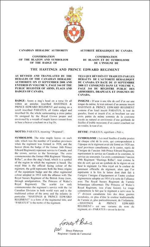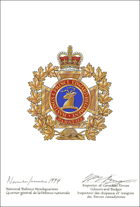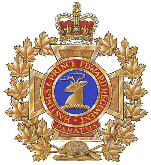 Badge of The Hastings and Prince Edward RegimentBlazonAzure a stag’s head on a torse Or all within an annulus inscribed HASTINGS & PRINCE EDWARD REGIMENT and resting on a scroll inscribed PARATUS, all Gules edged and inscribed Or, the whole surmounting a cross pattee Or ensigned by the Royal Crown proper and environed by a wreath of maple leaves issuant from in base a beaver couchant on a log Or; SymbolismThe nine maple leaves on each side, which was the number of Canadian provinces when the regiment was formed in 1920, and the beaver (from the badge of the former 16th Prince Edward Regiment) represent service to Canada, and the crown, service to the Sovereign. The cross commemorates the former 49th Regiment “Hastings Rifles”, as does the stag’s head, which is a symbol of the region in which the regiment is based. The royal blue is the official facing colour of the regiment, the gold represents both the brass origins of the equipment badge and the other regimental colour adopted in 1934 with the alliance with The Royal Sussex Regiment of the British Army (now, through amalgamation, The Princess of Wales’s Royal Regiment). The scarlet (or red) commemorates the regiment’s service with the 1st Canadian Division in both world wars and is the traditional colour of the army and the infantry in particular. “HASTINGS & PRINCE EDWARD REGIMENT” is a form of the regimental title, and “PARATUS” is the motto of the regiment. |