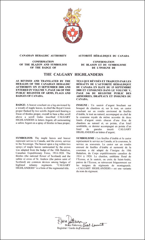 Badge of The Calgary HighlandersBlazonA beaver couchant on a log environed by a wreath of maple leaves, in chief the Royal Crown proper flanked by two scrolls Argent each bearing a frieze of thistles proper, overall in base a like scroll above a scroll Gules inscribed CALGARY HIGHLANDERS in letters Argent, all surmounting a saltire Argent on a spray of thistles in base proper; SymbolismThe maple leaves and beaver represent service to Canada, and the crown, service to the Sovereign. The beaver upon a log within two sprays of maple leaves surmounted by the crown was adapted from the badge of the 10th Battalion, Canadian Expeditionary Force, 1914-1920. The thistles (the national flower of Scotland) and the saltire or cross of St. Andrew (the patron saint of Scotland) are common devices among badges of highland infantry regiments. “CALGARY HIGHLANDERS” is a form of the regimental title. |
