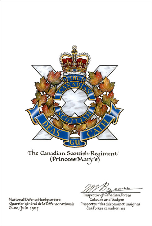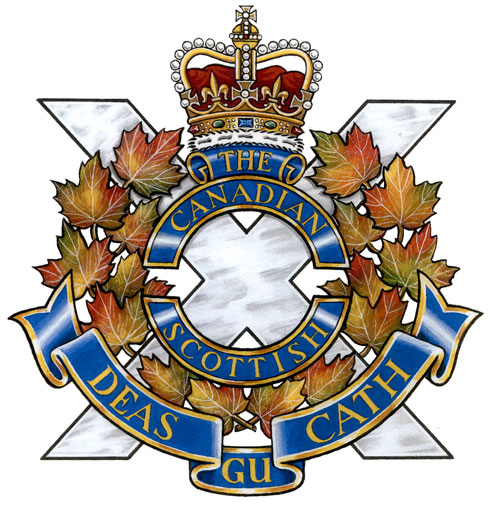Badge of The Canadian Scottish Regiment (Princess Mary's)BlazonA saltire Argent surmounted by a scroll above an annulus fracted in fess all Azure edged and inscribed THE CANADIAN SCOTTISH in letters Or, ensigned by the Royal Crown, environed by a wreath of sixteen autumnal maple leaves proper, and surmounted in base by a scroll Azure fimbriated and inscribed with the Motto in letters Or; SymbolismThe sixteen maple leaves are a reference to the service of the 16th Battalion of the Canadian Expeditionary Force during the First World War. The maple leaves represent service to Canada, and the crown, service to the Sovereign. The saltire or cross of St. Andrew, the patron saint of Scotland, is a common device among badges of highland infantry regiments. The words “THE CANADIAN SCOTTISH” are a form of the regimental title and “DEAS GU CATH” is the motto of the regiment. |