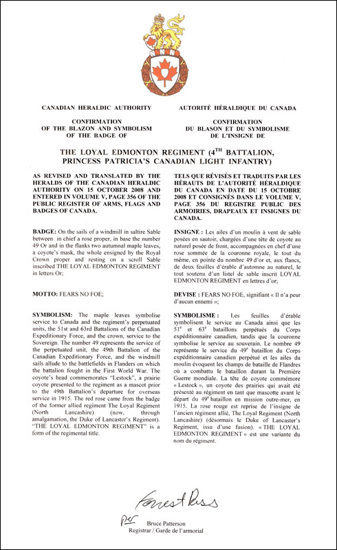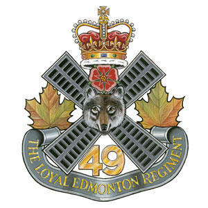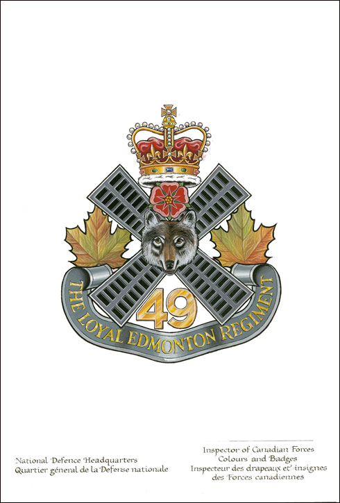 Badge of The Loyal Edmonton Regiment (4th Battalion, Princess Patricia’s Canadian Light Infantry)BlazonOn the sails of a windmill in saltire Sable between in chief a rose proper, in base the number 49 Or and in the flanks two autumnal maple leaves, a coyote’s mask, the whole ensigned by the Royal Crown proper and resting on a scroll Sable inscribed THE LOYAL EDMONTON REGIMENT in letters Or; SymbolismThe maple leaves symbolise service to Canada and the regiment’s perpetuated units, the 51st and 63rd Battalions of the Canadian Expeditionary Force, and the crown, service to the Sovereign. The number 49 represents the service of the perpetuated unit, the 49th Battalion of the Canadian Expeditionary Force, and the windmill sails allude to the battlefields in Flanders on which the battalion fought in the First World War. The coyote’s head commemorates “Lestock”, a prairie coyote presented to the regiment as a mascot prior to the 49th Battalion’s departure for overseas service in 1915. The red rose came from the badge of the former allied regiment The Loyal Regiment (North Lancashire) (now, through amalgamation, the Duke of Lancaster’s Regiment). “THE LOYAL EDMONTON REGIMENT” is a form of the regimental title. |
