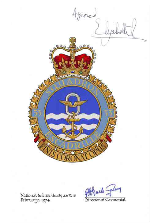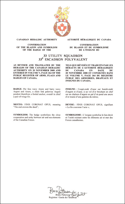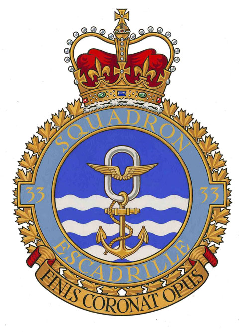 Badge of the 33 Utility SquadronBlazonPer fess wavy Azure and barry wavy Argent and Azure, a chain link palewise Argent pendent therefrom a fouled anchor, overall in chief a pair of wings Or; SymbolismThe badge symbolizes the close cooperation and unity between air and sea elements of the Canadian Forces. |