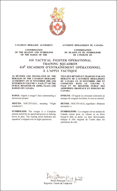 Badge of the 410 Tactical Fighter Operational Training SquadronBlazonArgent a cougar’s face surmounting a decrescent proper; SymbolismThe cougar is a Canadian animal noted for its speed and power in striking down its prey. The waning moon indicates the squadron’s original role in night operations. |