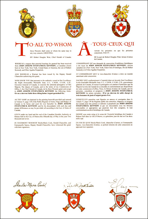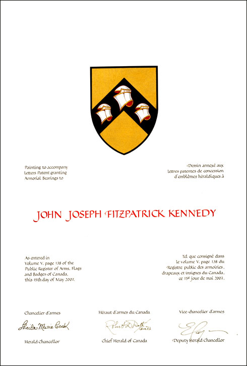 Additional InformationCreator(s)Original concept of John Kennedy, assisted by the heralds of the Canadian Heraldic Authority. PainterDebra MacGarvie CalligrapherShirley Mangione Recipient TypeIndividual Other InformationOne or more entries related to this Recipient's emblems appear elsewhere in the Register: Volume IV, p. 48. |