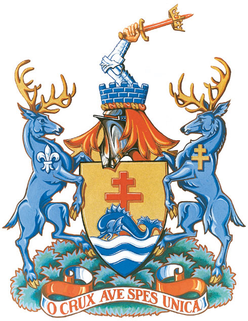 SupportersBlazonTwo deer Azure attired and unguled Or standing on a grassy mound the dexter charged on the shoulder with a fleur-de-lis Argent and the sinister with a cross of Lorraine Or; |