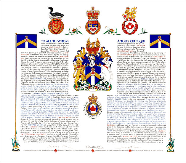 Additional InformationCreator(s)Original concept of Robert D. Watt, Chief Herald of Canada, assisted by the Heralds of the Canadian Heraldic Authority PainterLinda Nicholson CalligrapherJudith Bainbridge Recipient TypeCivil Institution
