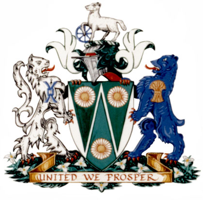 SupportersBlazonOn a meadow bearing trillium flowers proper dexter a lion Ermine charged on the shoulder with a mill rind Azure, sinister a bear Azure charged on the shoulder with a garb Or; |