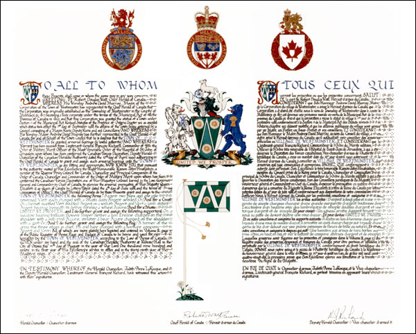 Additional InformationCreator(s)Original concept of David Bowyer, assisted by the heralds of the Canadian Heraldic Authority. PainterDavid Bowyer CalligrapherDavid Bowyer Recipient TypeCivil Institution