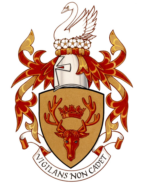 Arms of Kenneth John CalderBlazonOr a stag's head caboshed attired of twelve tines enclosing a Loyalist civil coronet Gules; SymbolismThe stag’s head is taken from the arms used by Scottish Calders. The Loyalist civil coronet refers to Kenneth Calder’s Loyalist ancestors. |